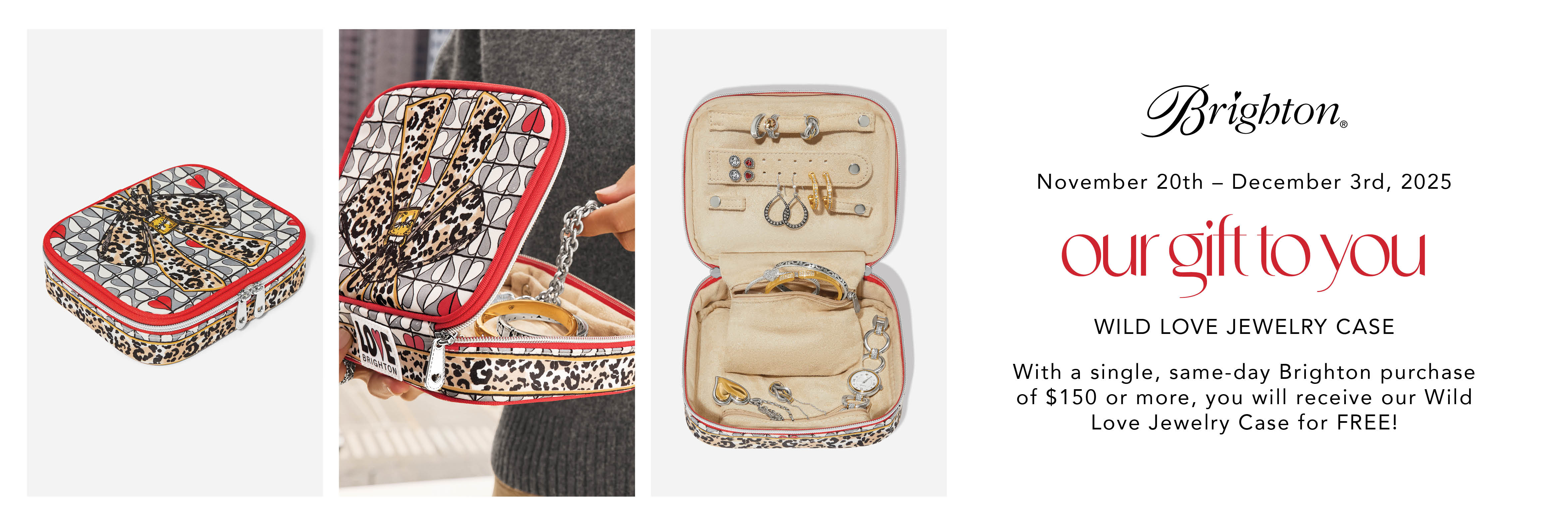 With a single, same-day Brighton purchase of $150 or more, you will receive our Wild Love Jewelry Case for FREE!