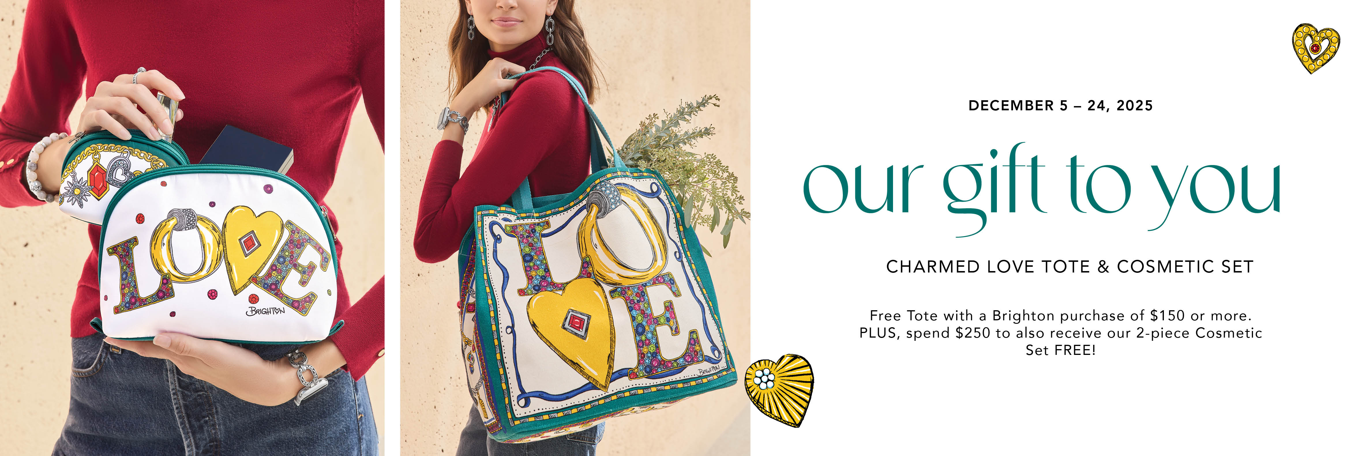 Free Brighton tote bag with a Brighton purchase of $150 or more. Plus spend $250 to also receive our Charmed Love 2-piece Cosmetic Set FREE!